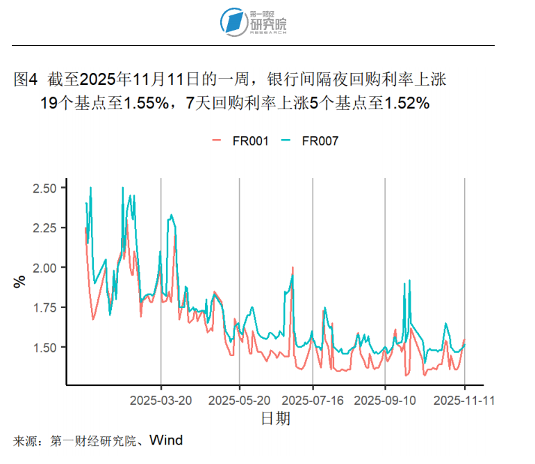 截至11月11日的银行间隔夜利率在过去一周上升19个基点至1.55%,在过去一个月上升23个基点,较去年同期下降15个基点。七天回购利率在过去一周上升5个基点至1.52%,在过去一个月上升12个基点,较去年同期下降36个基点。