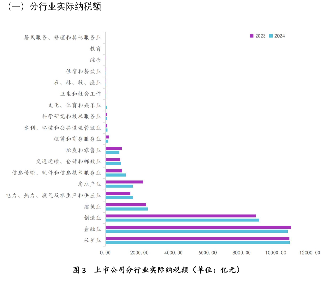 根据《报告》数据,2024 年,采矿业、金融业、制造业上市公司的实际纳税额总量位列前三,实际纳税额占上市公司总纳税额比例近 77%。比如在实际纳税额前100名上市公司里,采矿业(含煤炭和有色金属采选)占了12家,但实际纳税额占了全部 A 股上市公司实际纳税额的 1/4,约1万亿元。金融业上市公司实际纳税额约1万亿元,制造业紧随其后,超9000亿元。