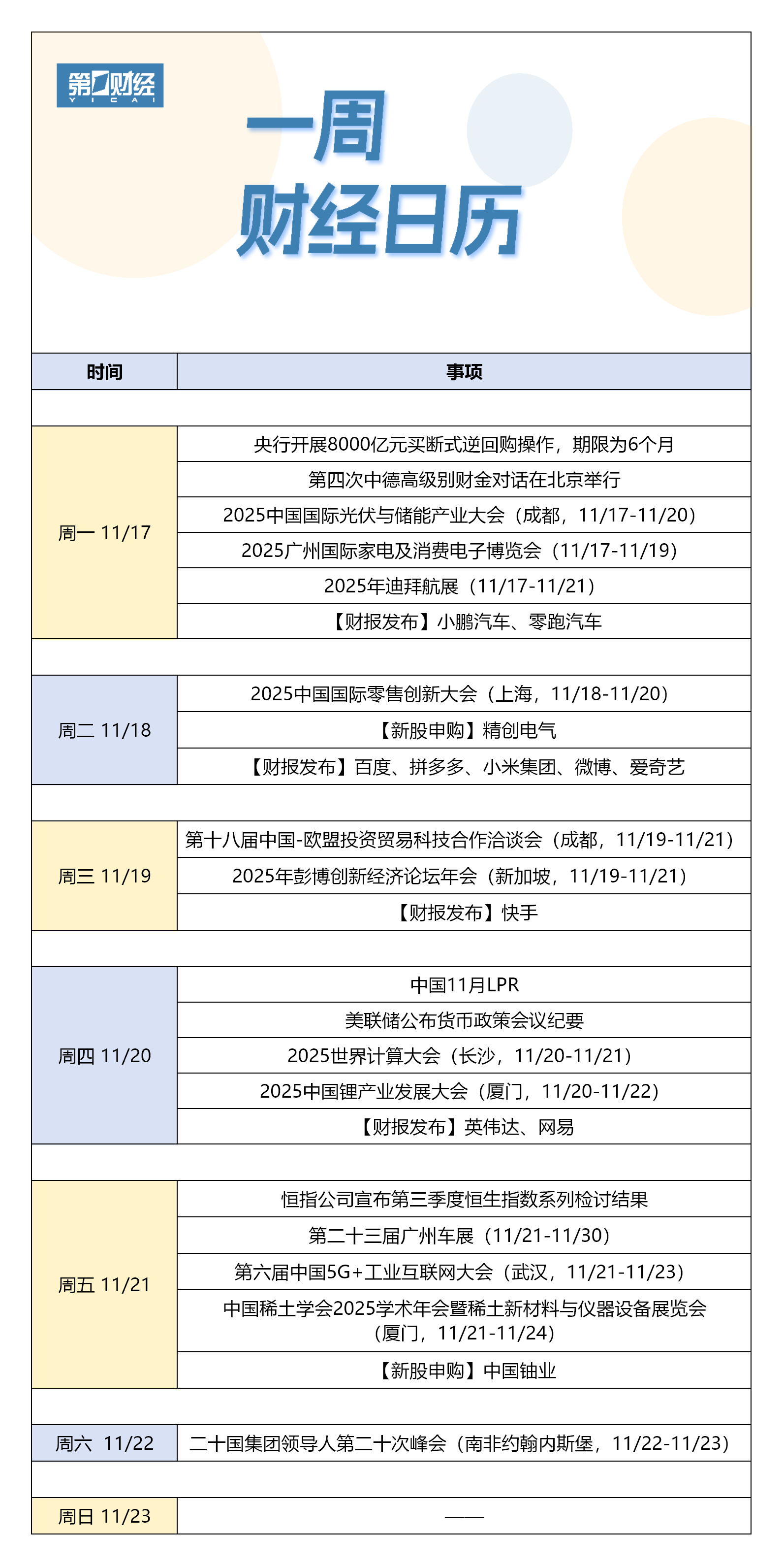 下周财经日历(11月17日-11月23日)