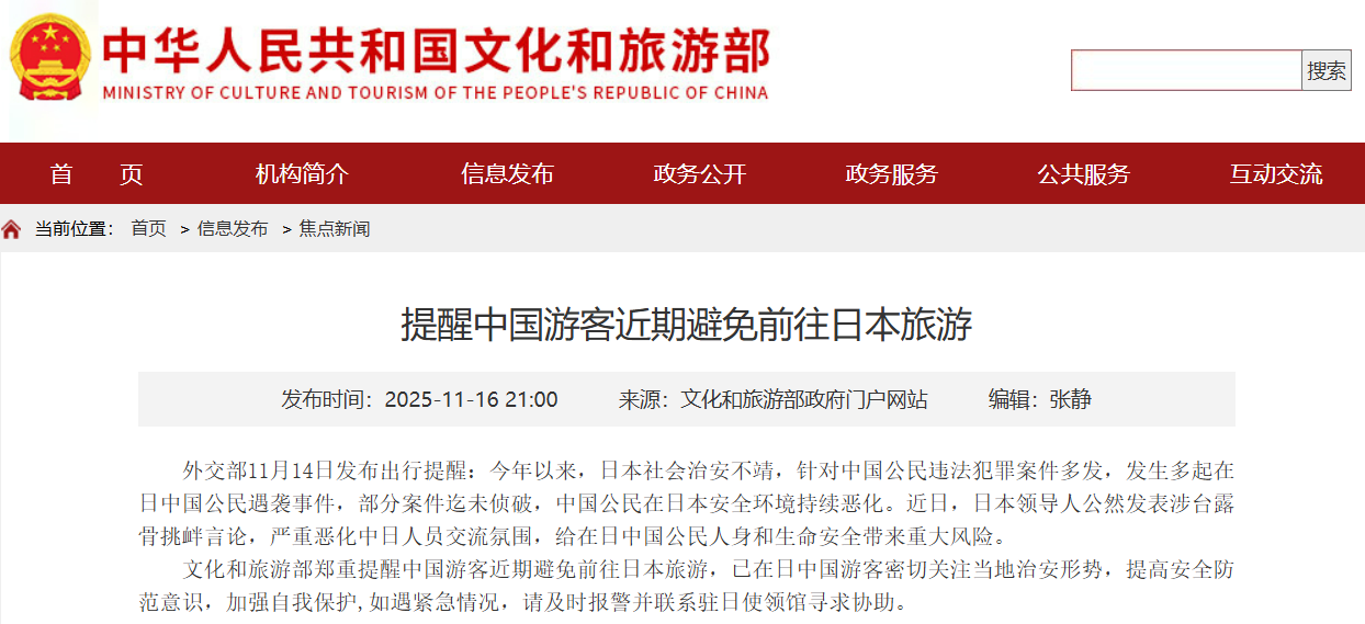 据文旅部消息,外交部11月14日发布出行提醒:今年以来,日本社会治安不靖,针对中国公民违法犯罪案件多发,发生多起在日中国公民遇袭事件,部分案件迄未侦破,中国公民在日本安全环境持续恶化。近日,日本领导人公然发表涉台露骨挑衅言论,严重恶化中日人员交流氛围,给在日中国公民人身和生命安全带来重大风险。