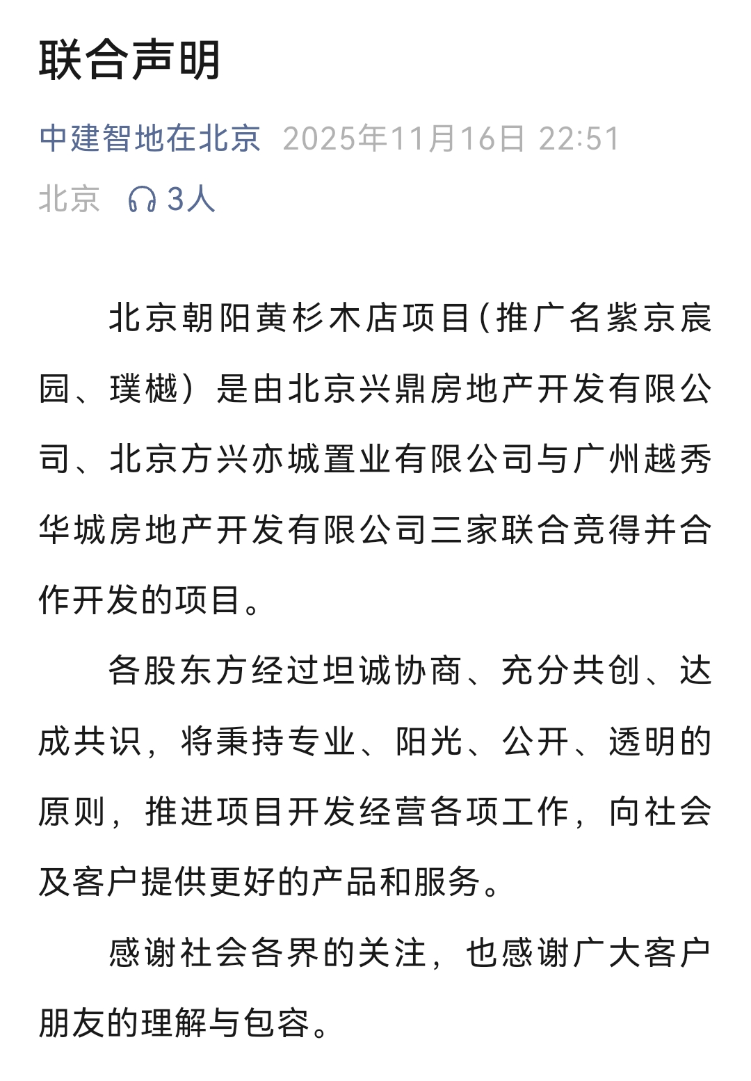 11月16日深夜,中建智地、越秀北京、金茂北京发布联合声明,针对北京朝阳黄杉木店项目(推广名紫京宸园、璞樾),各股东方经过坦诚协商、充分共创、达成共识,将秉持专业、阳光、公开、透明的原则,推进项目开发经营各项工作,向社会及客户提供更好的产品和服务。