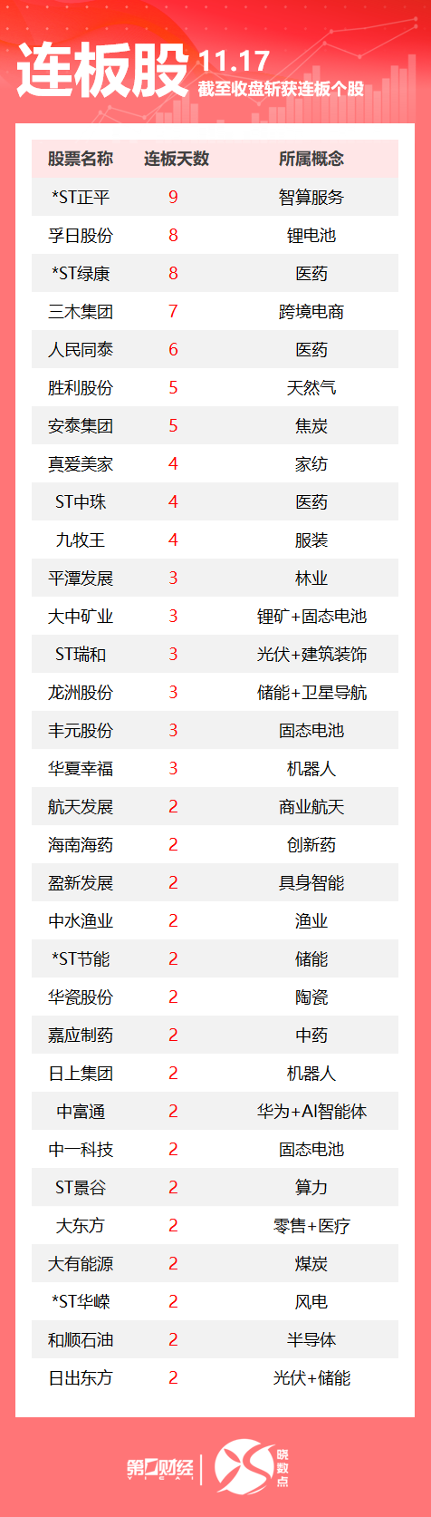 11月17日,Wind数据显示,A股市场共计100只个股涨停。其中锂电股孚日股份收获8连板,跨境电商板块三木集团7连板。一图速览今日连板股>>