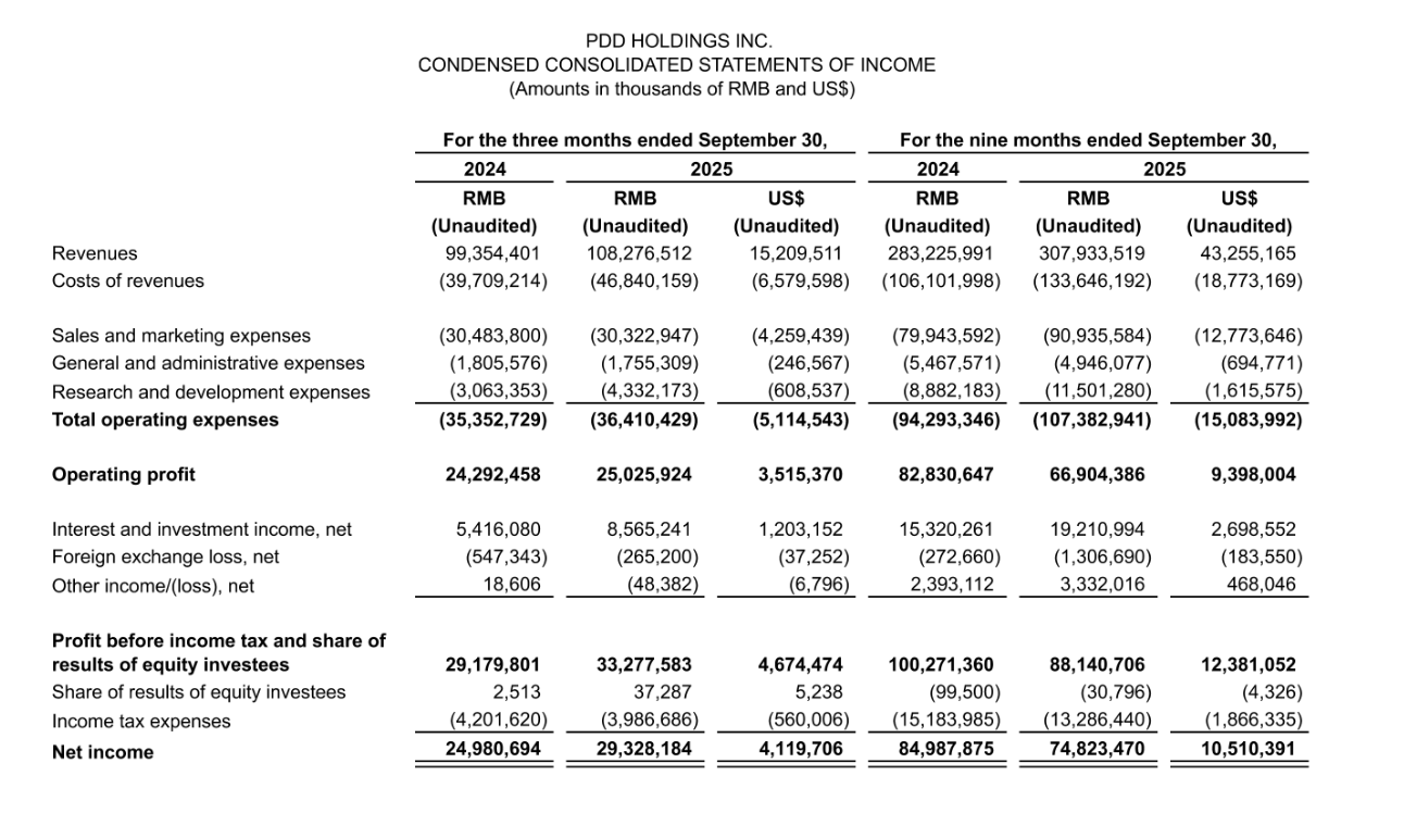 11月18日,拼多多(PDD.NYSE)发布截至9月30日的2025年第三季度财报,财报显示,拼多多本季度营收1082.8亿元,同比增长9%;非公认会计准则营业利润为270.8亿元,预估244.6亿元;归属股东净利润293.3亿元,同比增长17%;调整后每ADS收益 21.08元,预估16.86元。