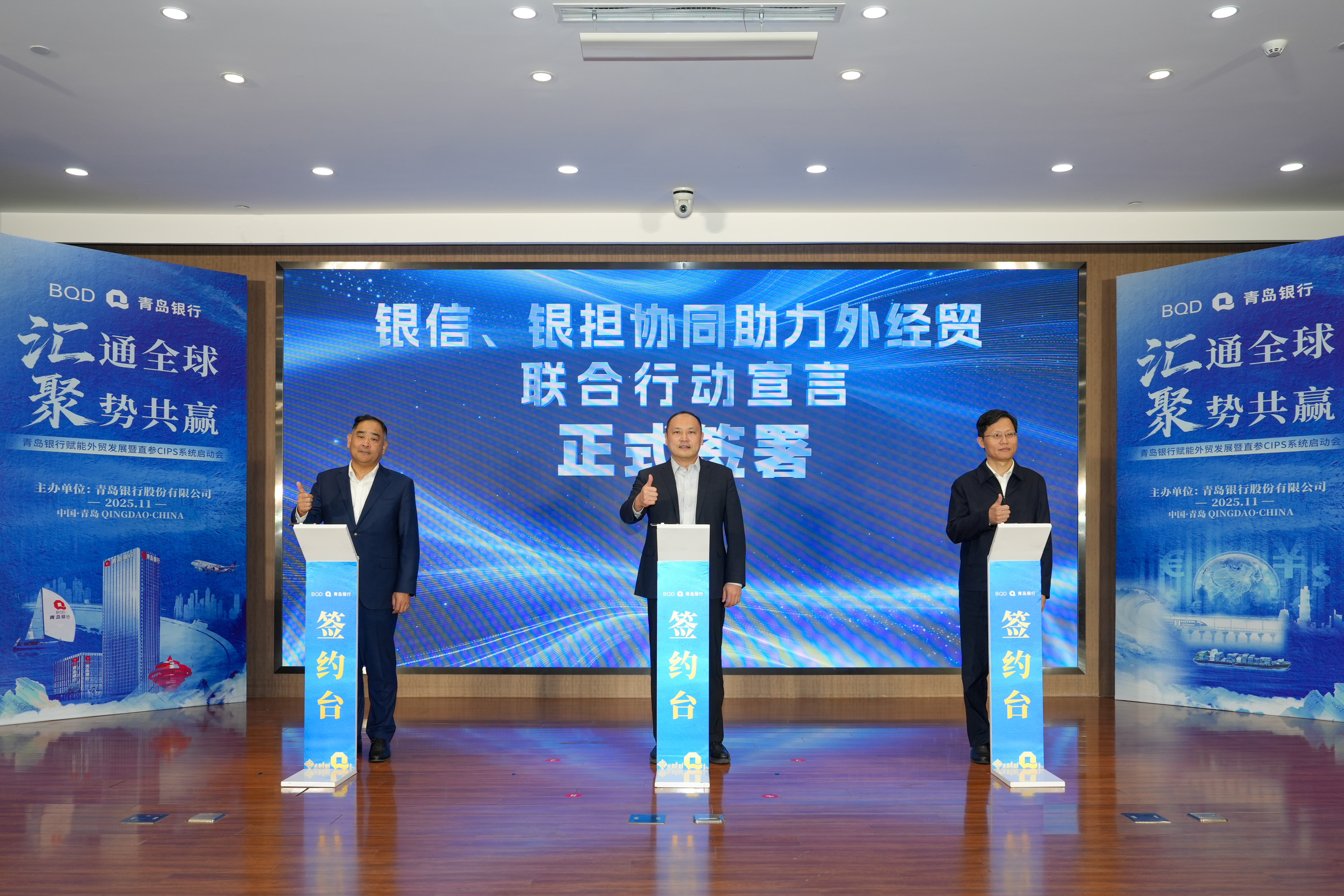 在全体嘉宾的见证下,多方领导共同点亮CIPS直参启动球,标志着青岛银行跨境人民币服务能力实现重要升级。