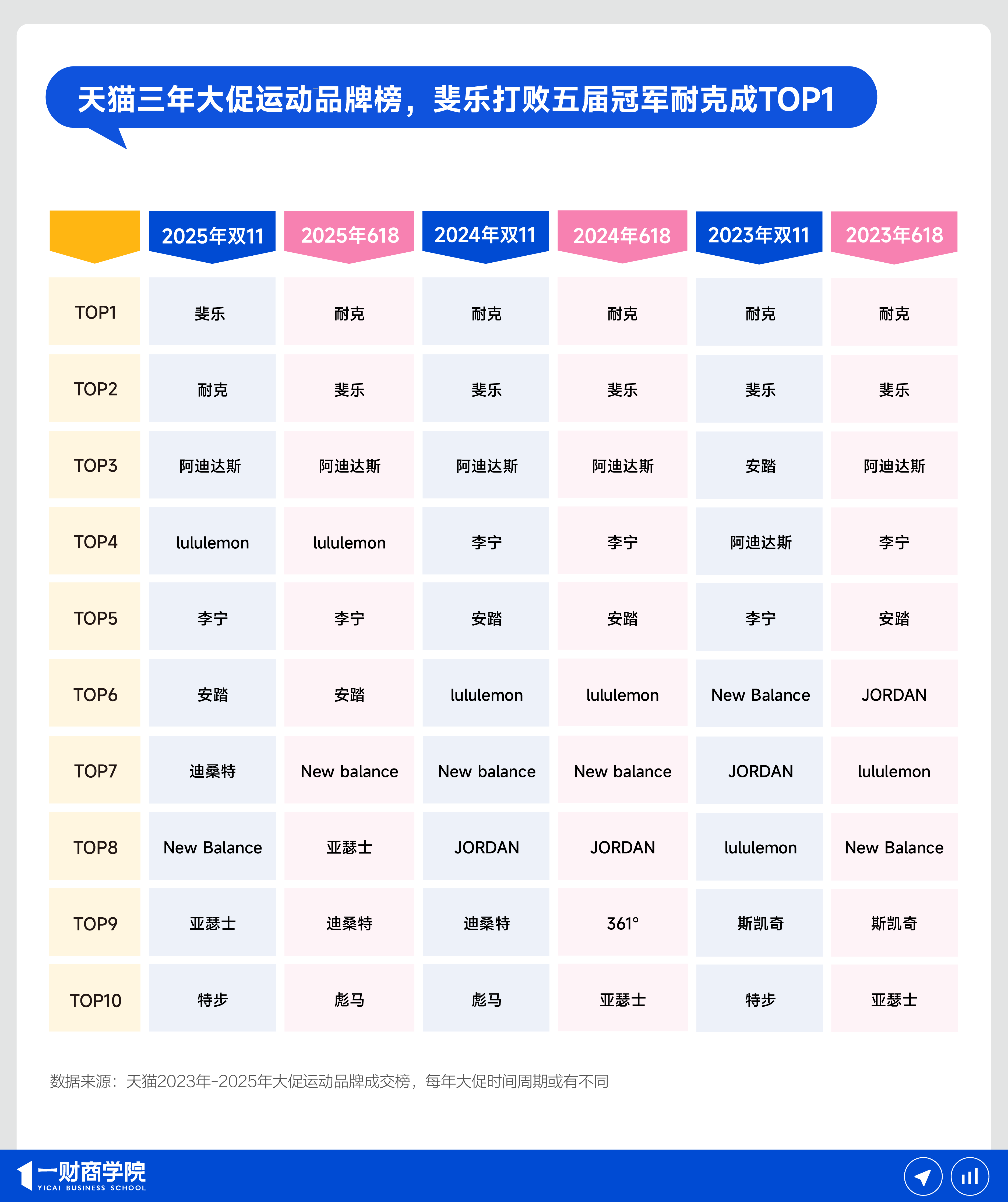 尽管并非所有品牌的经营重心都押在天猫,但当我们观察2023至2025年这三年、六次大促的榜单时,一些清晰的趋势便浮出水面。这是一个足够长的周期,足以滤掉偶然,沉淀必然。
