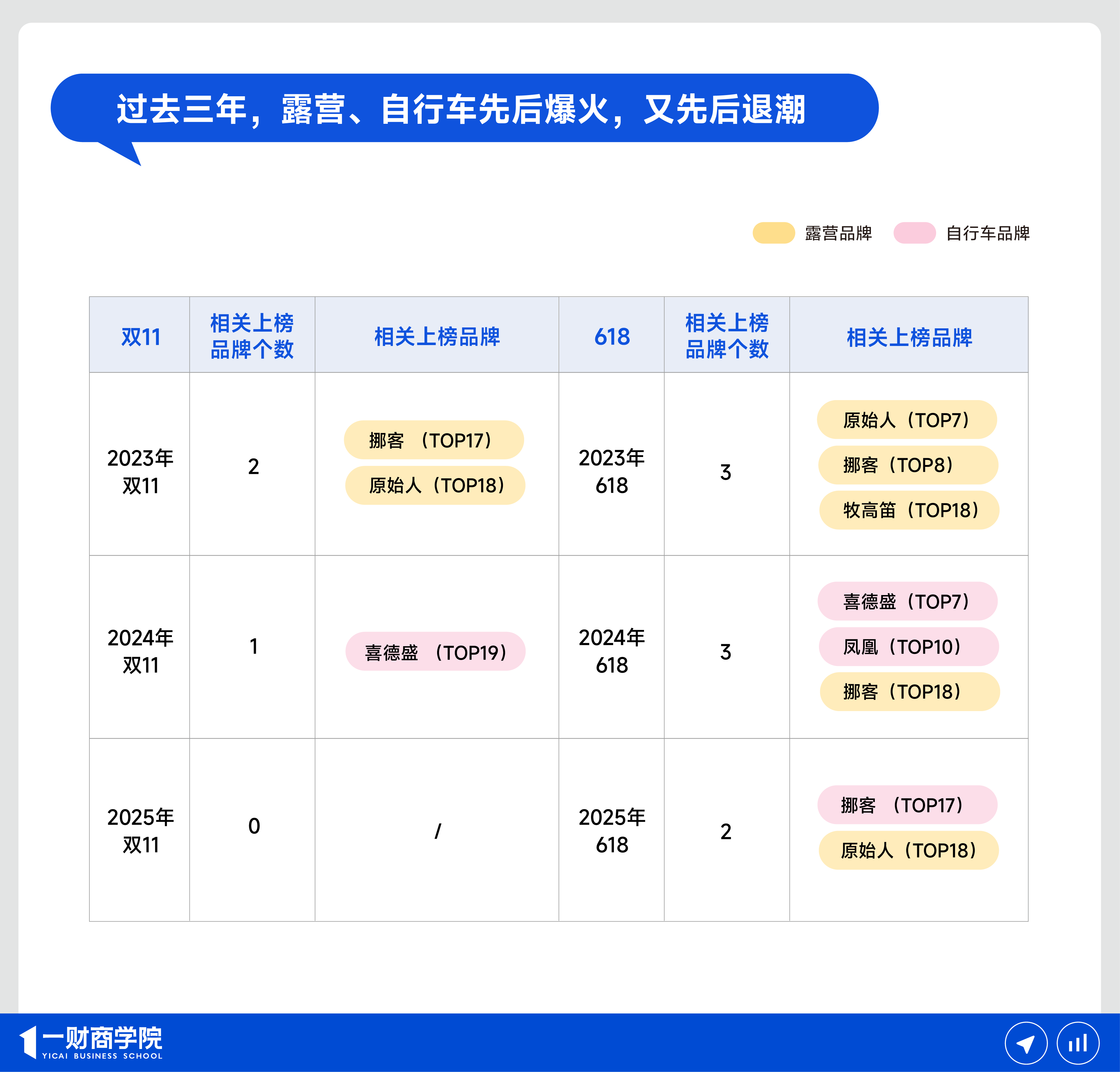 其次,是“品类周期性”。榜单的变化忠实地记录了这一点:2023年双11,尚有挪客和原始人两家露营品牌入榜;到了2024年双11,露营热已退,仅剩喜德盛一个自行车品牌苦苦支撑;而到了今年双11,这两个品类已从榜单上全面消失。