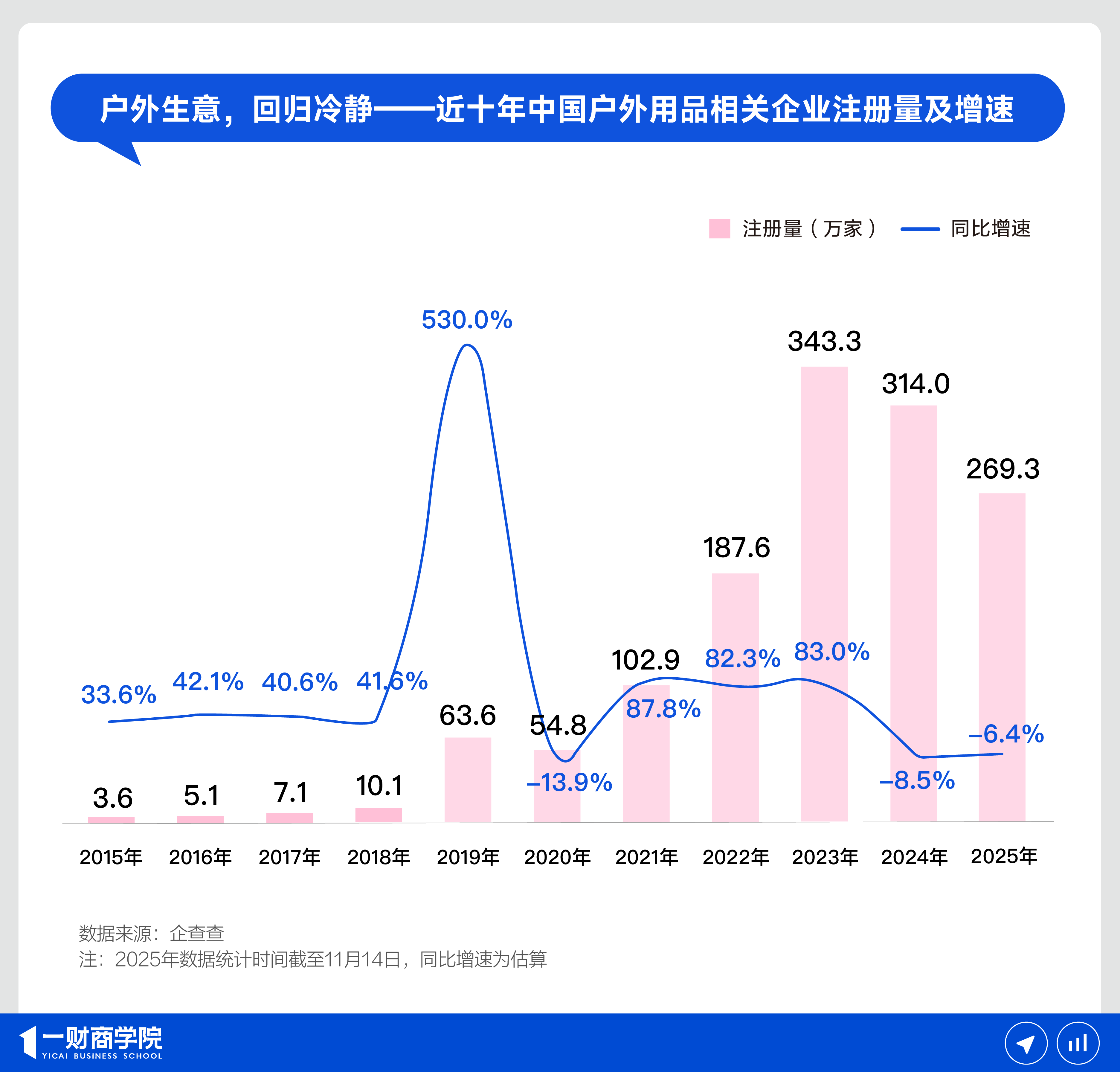 这一趋势,与更宏观的产业数据形成了印证。根据企查查数据,中国户外用品相关企业的注册量在2023年达到峰值后,2024年与2025年的增速已连续两年下滑。这表示行业虽然还在持续扩大,但红利期已过,接下来的将是更考验内功的“淘汰赛”。