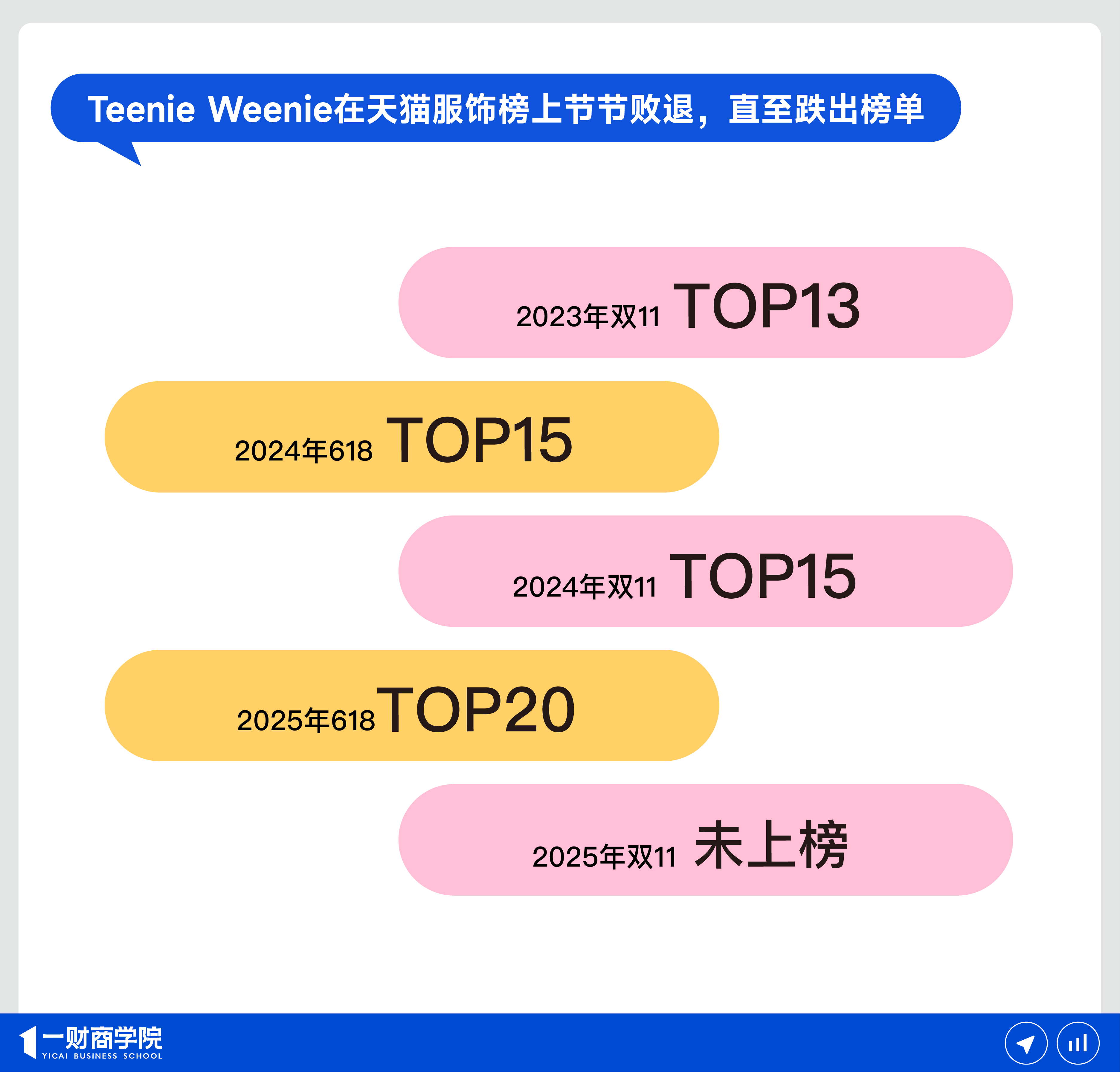 在潮流鼎盛期,Teenie Weenie也曾有过属于自己的辉煌。2023年,其母公司锦泓集团在线上线下推行了一系列改革,包括优化渠道、发力新零售、打造场景化直播间等,并取得了立竿见影的效果:2023年618,Teenie Weenie不仅蝉联抖音女装品类第一,在天猫女装排名跃升至第七,京东平台提升至第九名。 但2024年之后,Teenie Weenie出现了“节节败退”式的退步:从2023年天猫双11服饰类目TOP13,到2024年618和双11的第15,再到今年618的榜末,直至今年双11,彻底跌出Top 20。