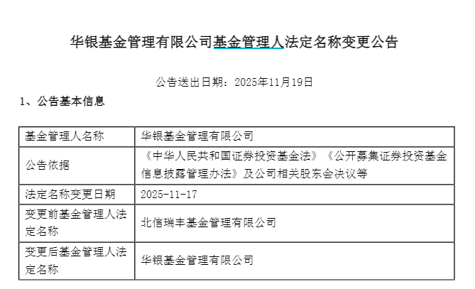 11月19日,原北信瑞丰基金管理有限公司公告称,该公司名称已正式变更为“华银基金管理有限公司”,目前已完成工商变更登记手续,后续将对名下基金产品名称进行相应变更。