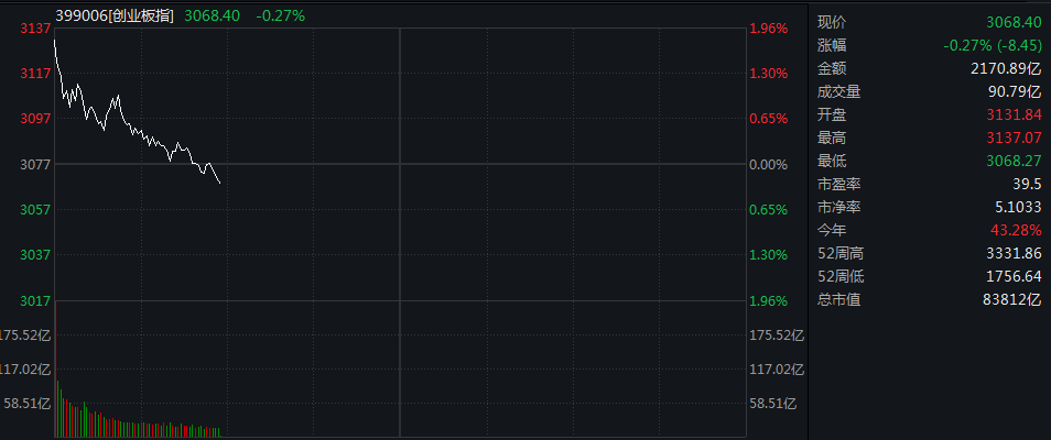 10:28 创业板指回落翻绿,早盘一度涨近2%,沪指、深成指涨幅均大幅收窄。旅游酒店、食品消费、纺织服装等方向跌幅居前,市场下跌个股超3900只。