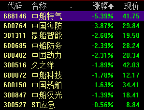 中船系板块调整,板块内全线飘绿,中船特气跌超5%。