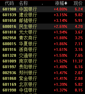 具体来看,银行板块全线走强,中国银行涨4%,建设银行、邮储银行涨超3%,民生银行涨超2%。