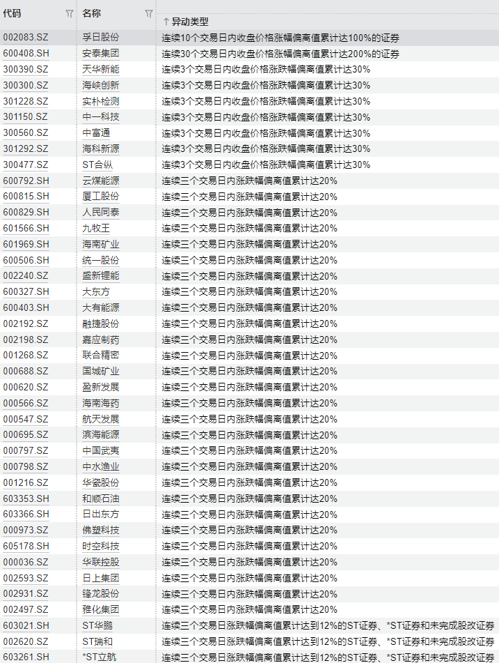 截至11月20日,近日A股有18只个股连续异动2个交易日及以上。九牧王连续10个交易日内收盘价格涨幅偏离值累计达100%。华融化学、*ST东通连续3个交易日内收盘价格涨跌幅偏离值累计达30%。国风新材、大有能源、安泰集团等连续三个交易日内涨跌幅偏离值累计达20%。ST中迪、*ST原尚连续三个交易日涨跌幅偏离值累计达到12%。