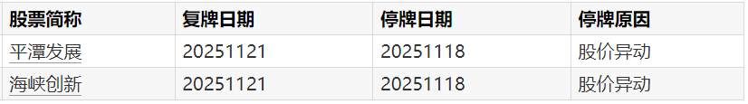 Wind数据显示,11月21日,平潭发展、海峡创新复牌。