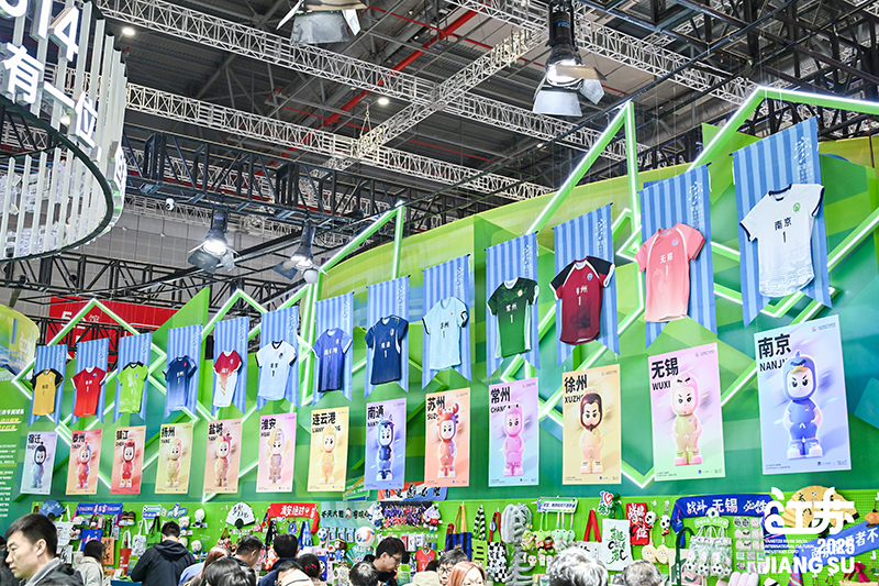 江苏展区内,现象级IP“苏超”成为焦点,各市队服吸引不少观众拍照打卡。这项足球赛事衍生出的文旅线路、文创产品和科技应用,展现了体育与文化融合的活力。展区还呈现了AR眼镜等一系列科技产品,以及扎染等传统文化在科技赋能下的新生。