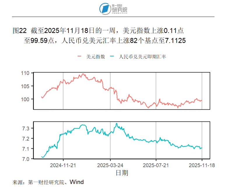 高频数据显示,截至11月18日的一周,美元指数上升0.11点至99.59点;人民币对美元汇率上升82个基点至7.1125。