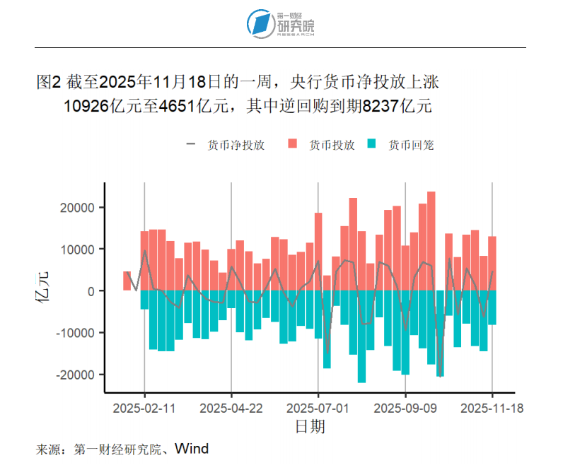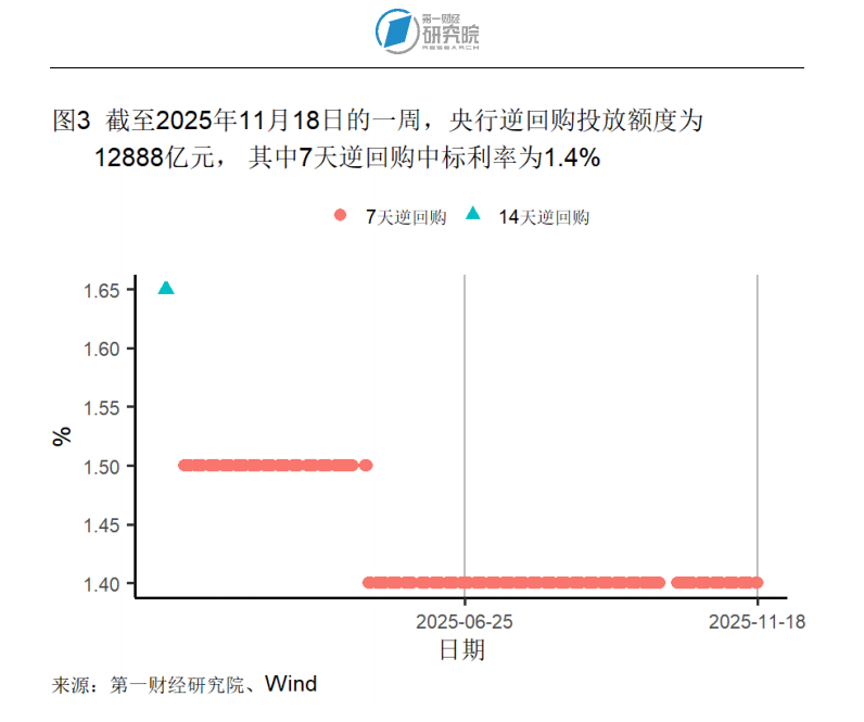 截至11月18日的一周,央行通过公开市场净投放资金4651亿元。本周,央行逆回购投放额度为12888亿元,逆回购到期8237亿元,7天逆回购中标利率为1.4%。