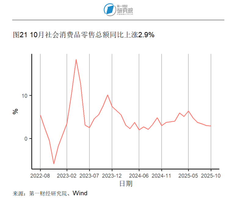 国家统计局公布10月经济数据。消费方面,10月,社会消费品零售总额为46291.3亿元,同比增长2.9%,增速低于上月0.1个百分点。其中,商品零售同比增速低于上月0.5个百分点至2.8%,增速连续五个月走低;餐饮收入同比增速则回升了2.9个百分点至3.8%,为6月以来的最高水平。汽车方面,10月汽车销量同比增长8.82%,增速低于上月6.04个百分点。
