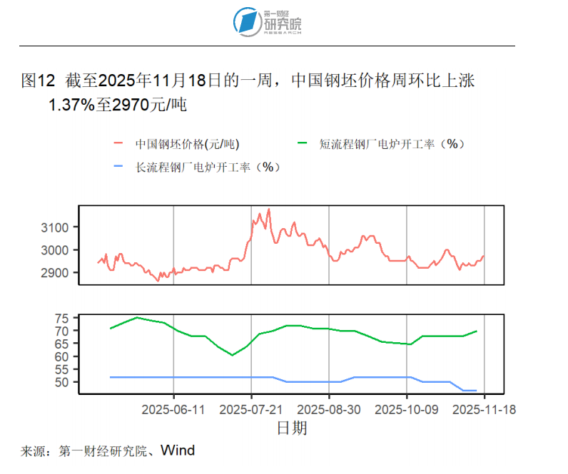 开工率方面,截至11月14日的短流程钢厂电炉开工率由一个月前的64.58%上升至69.79%;长流程钢厂电炉开工率则由一个月前的51.67%下降至46.67%。截至11月13日的全钢胎汽车轮胎开工率由一周前的65.46%下降至64.50%,高于去年同期4.29个百分点;半钢胎汽车轮胎开工率由一周前的73.67%上升至73.68%,低于去年同期5.51个百分点。