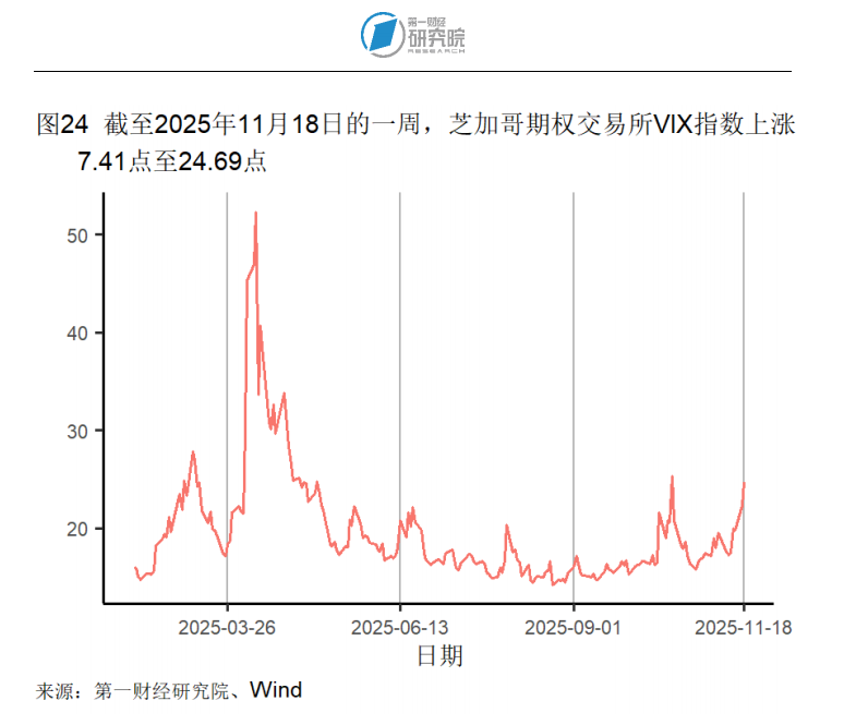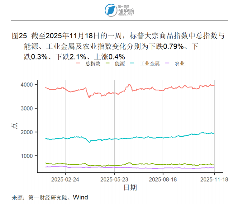 截至11月18日的一周,芝加哥期权交易所VIX指数上升7.41点至24.69点。标普大宗商品总指数在本周下降0.79%至3972.46。能源和工业金属指数分别下降0.3%和2.1%至656.03和1904.56;农业指数则上升0.4%至494.42。