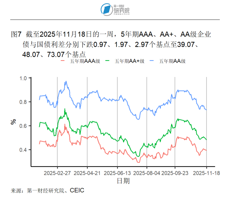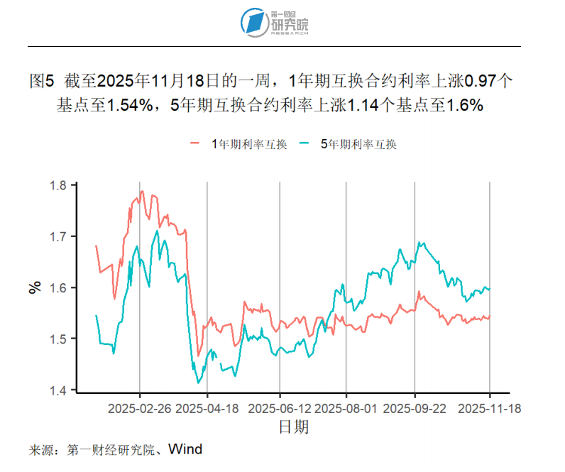 截至11月18日的1年期互换合约利率在过去一周上升了1个基点至1.55%,较一个月前上升了2个基点,较去年同期下降了13个基点。5年期互换合约利率与一个月前水平一致(1.60%),在过去一周上升了1个基点,较去年同期下降了12个基点。