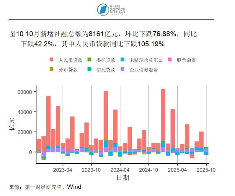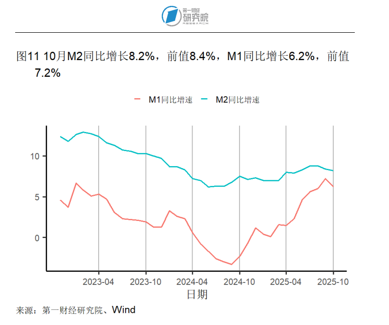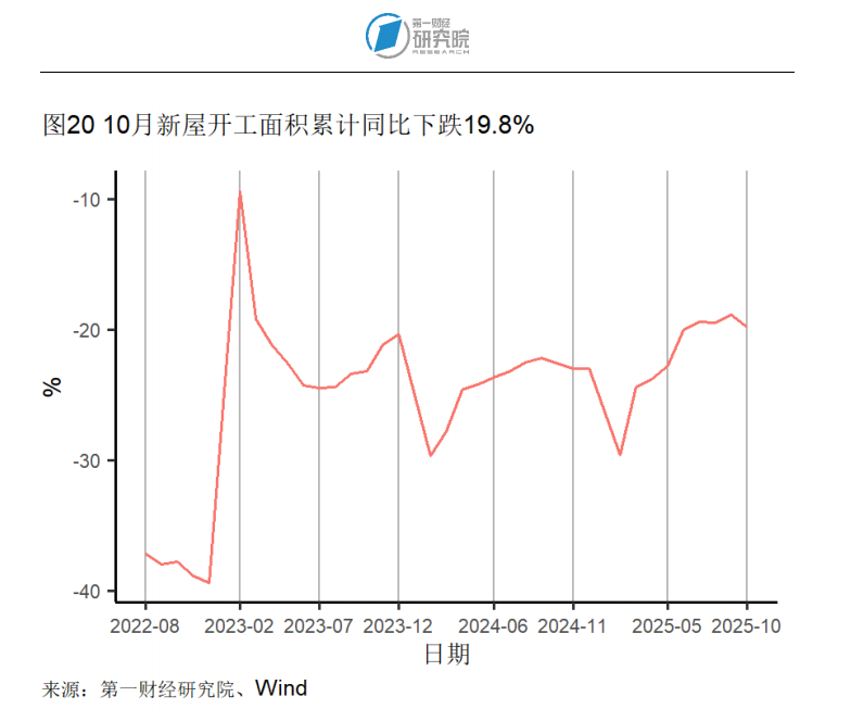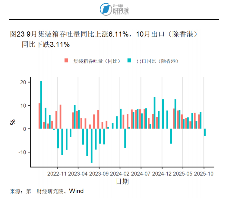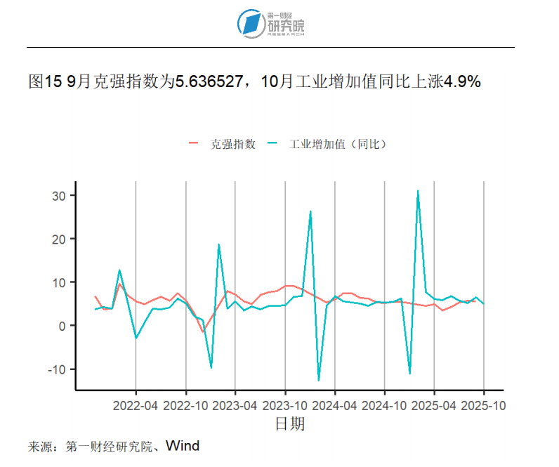 分产业来看,10月,规模以上工业增加值同比增长4.9%,增速低于上月1.6个百分点。其中,采矿业和制造业增加值同比增速分别由上月的6.4%和7.3%降低至4.5%和4.9%;电力、燃气及水的生产和供应业增加值同比增速则由上月的0.6%回升至5.4%。服务业方面,10月,服务业生产指数同比增速低于上月1.0个百分点至4.6%,为3月以来的最低值。
