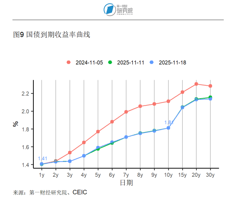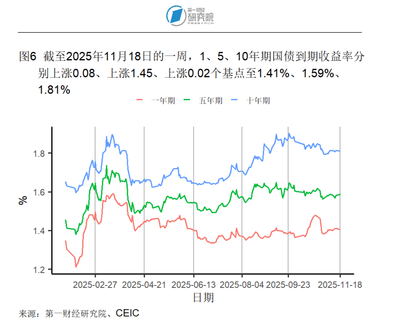 截至11月18日的一周,1年期、5年期和10年期国债到期收益率分别上升了0.08、1.45和0.02个基点至1.41%、1.59%和1.81%。