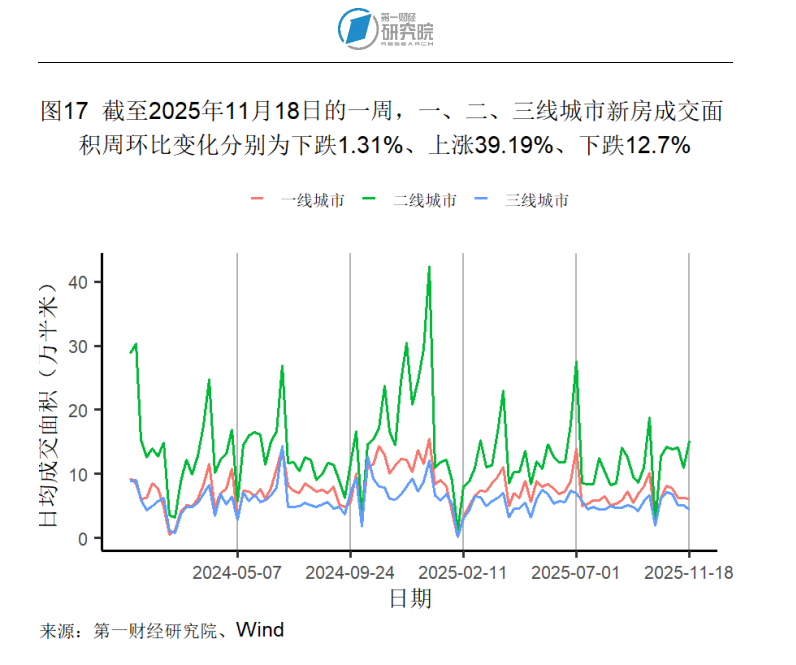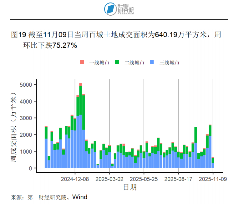截至11月18日的一周中,新房方面,一、三线城市与二线城市分化。其中,一线城市和三线城市新房成交面积分别环比下降1.31%和12.7%;二线城市新房成交面积则环比上升39.19%。二手房方面,一、二、三线城市二手房成交面积分别环比上升9.02%、5.04%和15.21%。本周,除二线城市新房外,其余房屋日均成交面积均低于去年同期水平。截至11月9日的一周,百城土地成交面积为640.19万平方米,周环比下降75.27%。