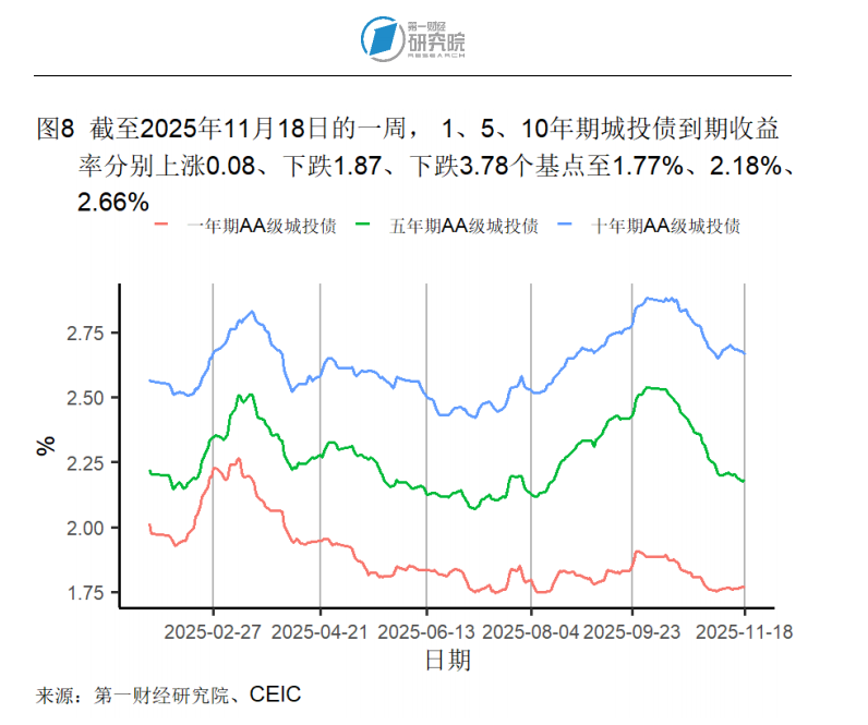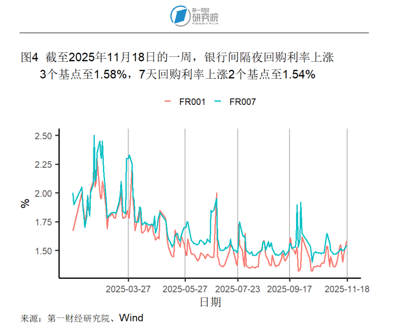 截至11月18日的银行间隔夜利率在过去一周上升了3个基点至1.58%,在过去一个月上升了21个基点,较去年同期下降了7个基点。七天回购利率在过去一周上升了2个基点至1.54%,在过去一个月上升了6个基点,较去年同期下降31个基点。
