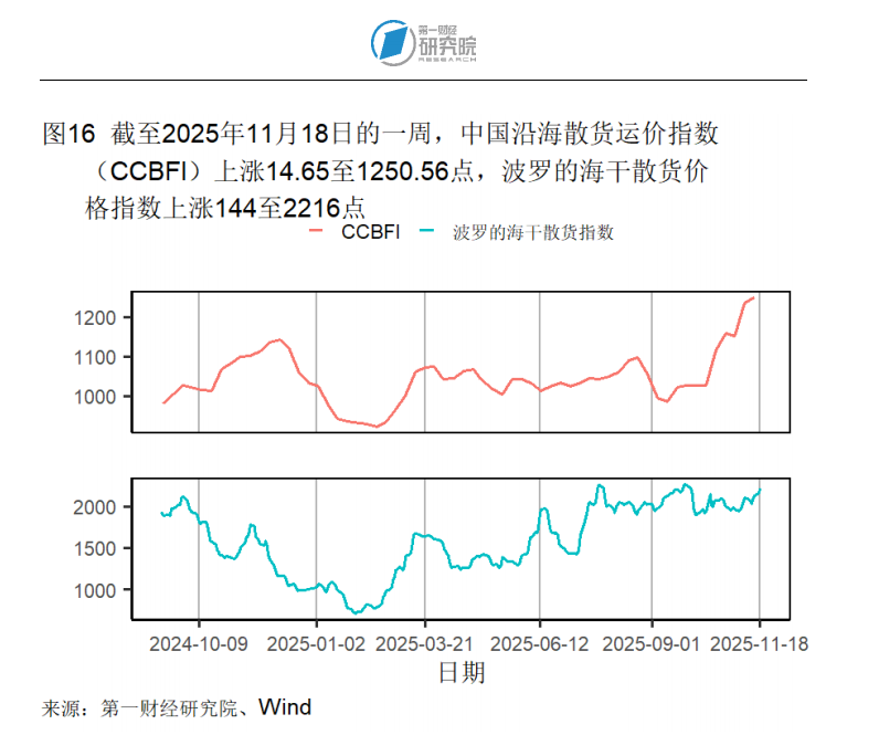 中国沿海散货运价指数(CCBFI)在截至11月18日的一周上升14.65点至1250.56点;波罗的海干散货价格指数上升144点至2216点。