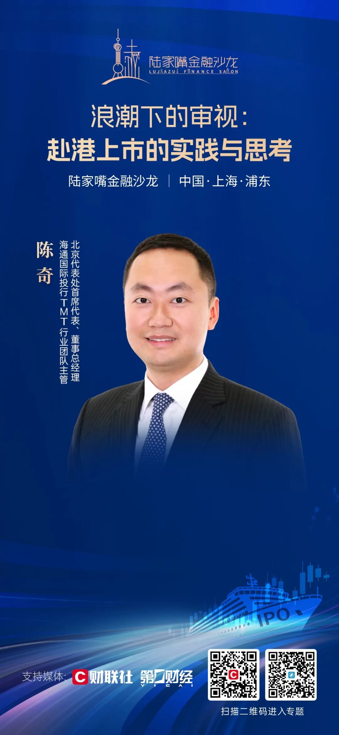 海通国际投行TMT行业团队主管、北京代表处首席代表、董事总经理陈奇将担任本场沙龙的主嘉宾,并发表主题演讲。他拥有近二十年海外资本市场经验,曾牵头或参与完成数十个海外首次公开发行项目,累计融资金额超过百亿美元,行业覆盖科技、金融等领域。
