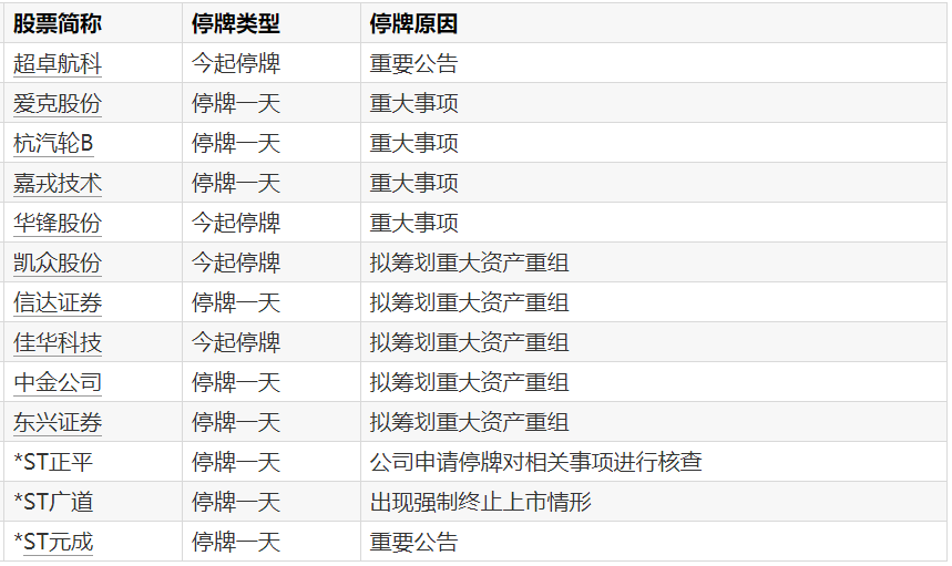 Wind数据显示,11月24日,超卓航科、爱克股份、杭汽轮B等13只个股停牌。