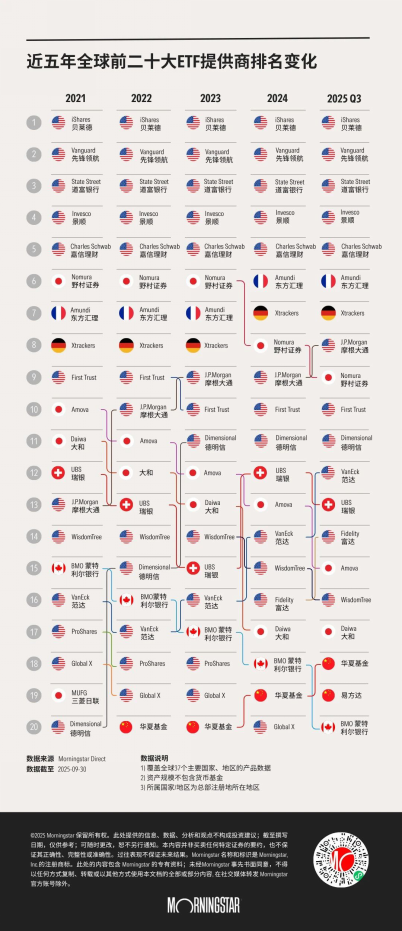 近日,晨星(Morningstar)2025年三季度全球前20大ETF提供商排名出炉,两家中国公募基金公司跻身全球前二十大ETF提供商。其中,华夏基金的位次变化引人瞩目:截至2025年Q3,旗下ETF管理规模达1268亿美元,排位从上一年的第19名,进一步提高到第18名。自从其2022年成为我国首家跻身全球20强的ETF提供商,2024年、2025年连续两年排位一步一台阶地跃升,华夏基金正从境内“ETF一哥”走向全球ETF“头部玩家”行列。