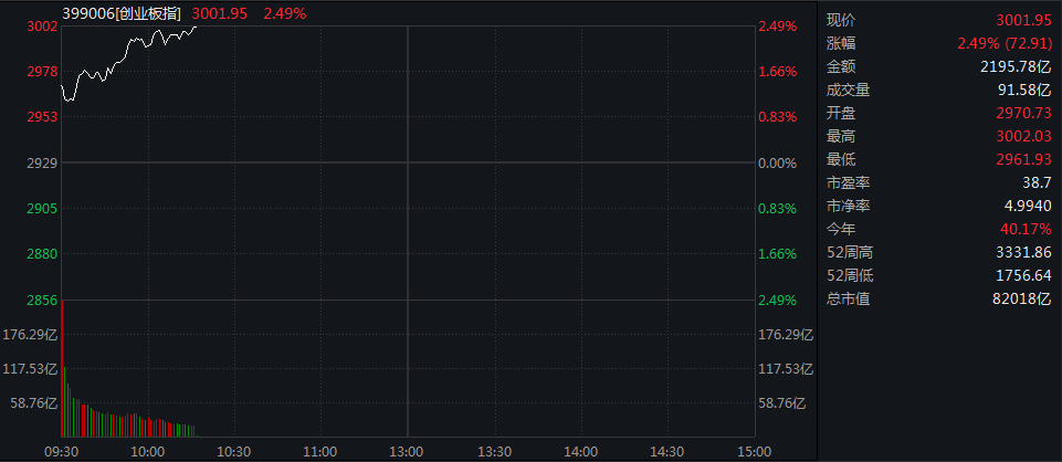 10:17 创业板指突破3000点整数关口,涨2.49%。CPO概念、光通信模块、PCB等板块涨幅居前。