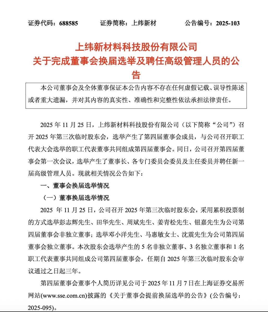 1125日,上纬新材料科技股份有限公司(688585.SH)(以下简称“上纬新材”)召开了2025 年第三次临时股东会。根据公司公告披露,本次临时股东会通过累积投票制的方式选举了彭志辉、田华、周斌、姜青松、钮嘉为公司第四届董事会非独立董事。