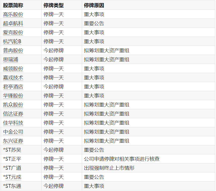 A股停牌提示:13股今日停牌