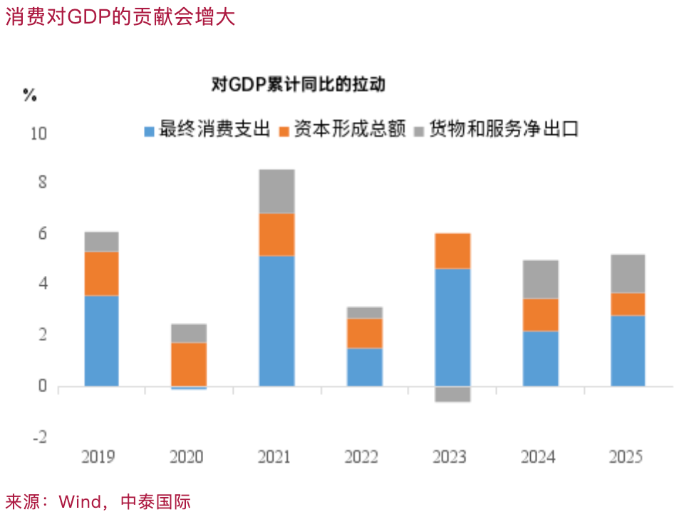 GDP用支出法计算的三驾马车,分别是资本形成、最终消费和净出口。今年如果能实现5%的增速,则最终消费的贡献要超过一半,因为资本形成(投资)的贡献下降了。今后如果出口增速也下降,那么,消费对经济增长的贡献率会越来越大。