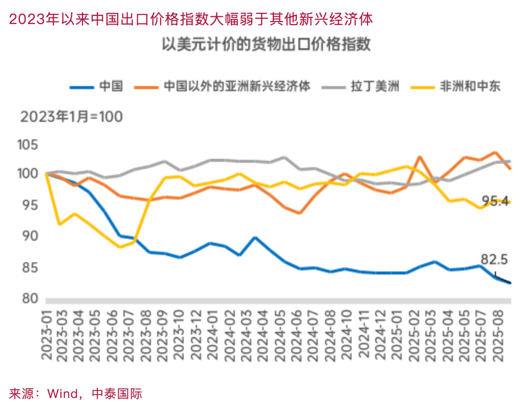 今年美国和欧盟的进口增速也超预期,其中,欧盟前10月商品进口(美元)累计增长7%,美国增长8.8%。此外,我国出口价格指数还是下行,从2023年至今累计下行了18%。