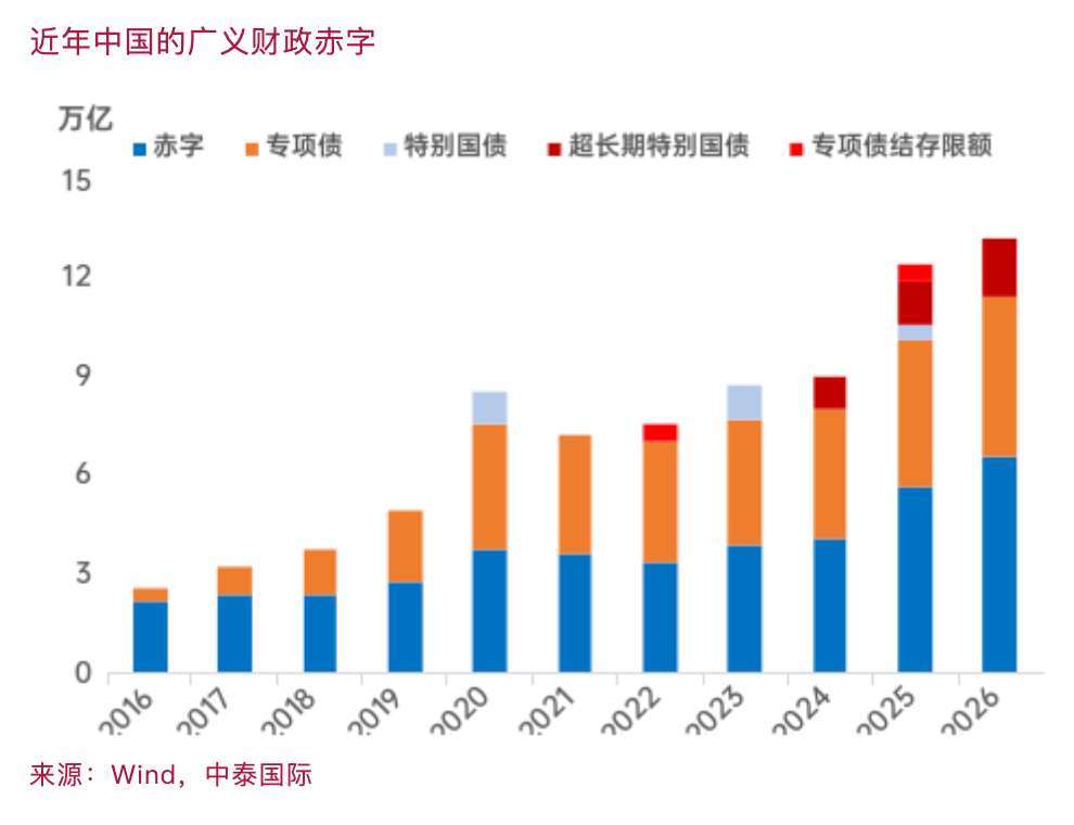预计2026年广义赤字将有1.3万亿元左右的增量,从11.9万亿元左右提高到13.2万亿元左右,对应的广义赤字率从8.4%左右提高到9%左右。其中,公共财政赤字率从今年的4%提高到4.5%,对应赤字约为6.6万亿元。广义财政赤字中,新增专项债额度或从4.4万亿元提高到4.8万亿元,同时发行超长期特别国债1.8万亿元,比今年增加5000亿元。