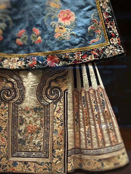 展览依据传统马面裙的美学演变为划分,先在序篇中呈现马面裙的形制起源,后以马面裙的定形与发展为题,共分为三个单元。第一单元“方兴未艾”,展示明代马面裙及其同期的袍,袄等;第二单元“百紫千红”,展示清代的阑干、月华、凤尾及百褶鱼鳞裙,辅以袄、褂,马面绣片等,呈现出清代丰富的裙型与华美的装饰;第三单元“简雅凝练”,展示20世纪初在西风东渐下,马面裙形制及装饰上的简化。