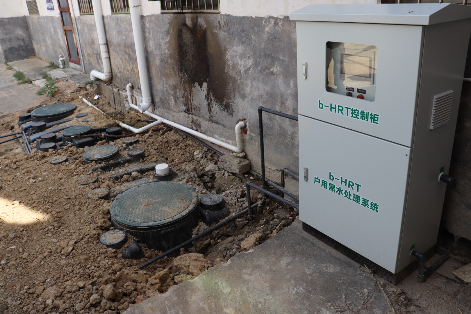 示范项目采用“b-HRT成套设备”的户用黑灰水协同处理技术路线。农户厕所黑水(及部分灰水)经三格化粪池或调节池预处理后进入 b-HRT 设备,在生物净化槽、深度处理槽和河马井等单元内完成有机物去除、固液分离和进一步净化,末端通过ECR电化学进一步杀灭致病病源菌,满足ISO30500《无下水道厕所卫生处理系统标准》,实现就地达标排放或循环冲厕回用。