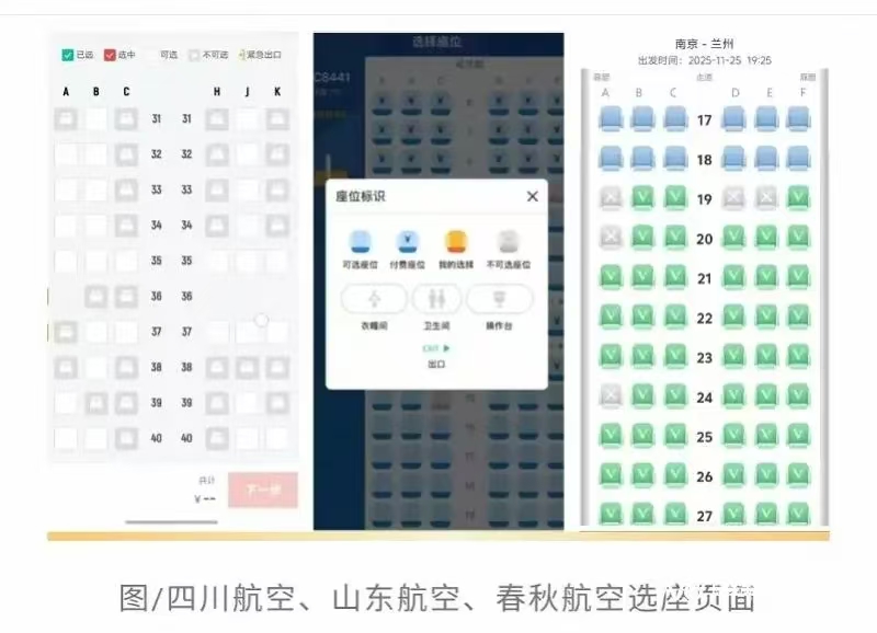江苏消保委的调查中也提到,在四川航空、山东航空、春秋航空3家航司的选座页面上,不可选且无解锁渠道的座位未明确标注是航司锁定还是已被其他乘客选走,这三家航司的锁座率分别达到31.2%,30.7%和62.1%。