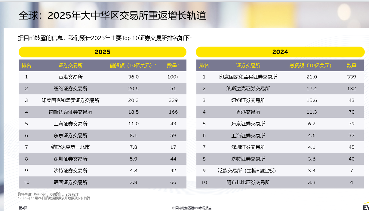 11月27日,安永发布2025年《中国内地和香港IPO市场回顾及展望》报告。报告预计,香港交易所以全年360亿美元融资额跃居全球交易所榜首。上海证券交易所则以110亿美元位列全球交易所第五,较去年上升一位。
