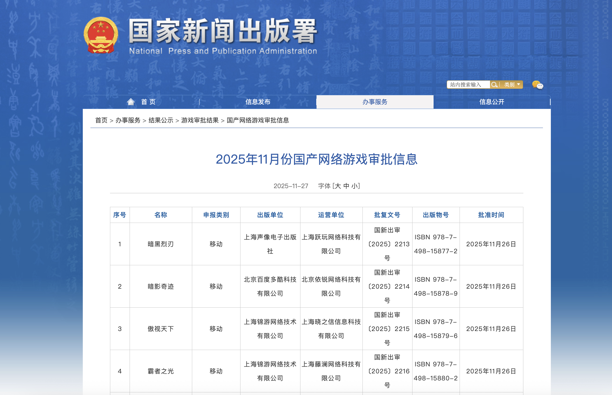 11月27日,国家新闻出版署发布了《2025年11月份国产网络游戏审批信息》。本批次版号共计184款,其中国产游戏版号178个,进口游戏版号6个。