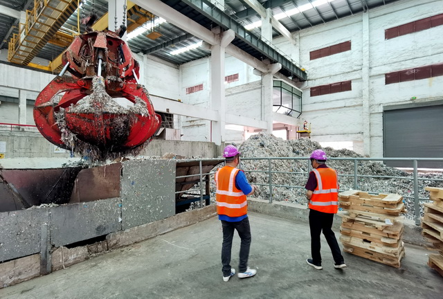 在一个篮球场大小的废渣池里,堆满了破塑料袋、饮料瓶碎渣、变形的易拉罐、胶粘物等杂质,巨大的抓斗把这些杂质放进输送带,再进入固废物焚化炉处理,转化为蒸汽能源。