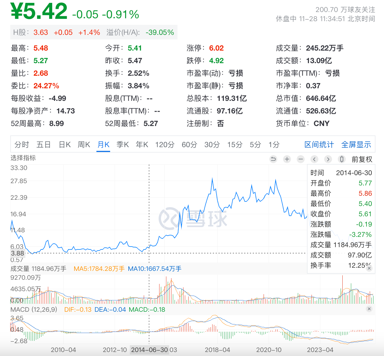 11月28日,万科A(000002)、万科企业(02202.HK)依旧持续下挫。盘中,万科A跌一度超3.6%。截至发稿,万科A报5.42元,股价水平跌回至2014年。