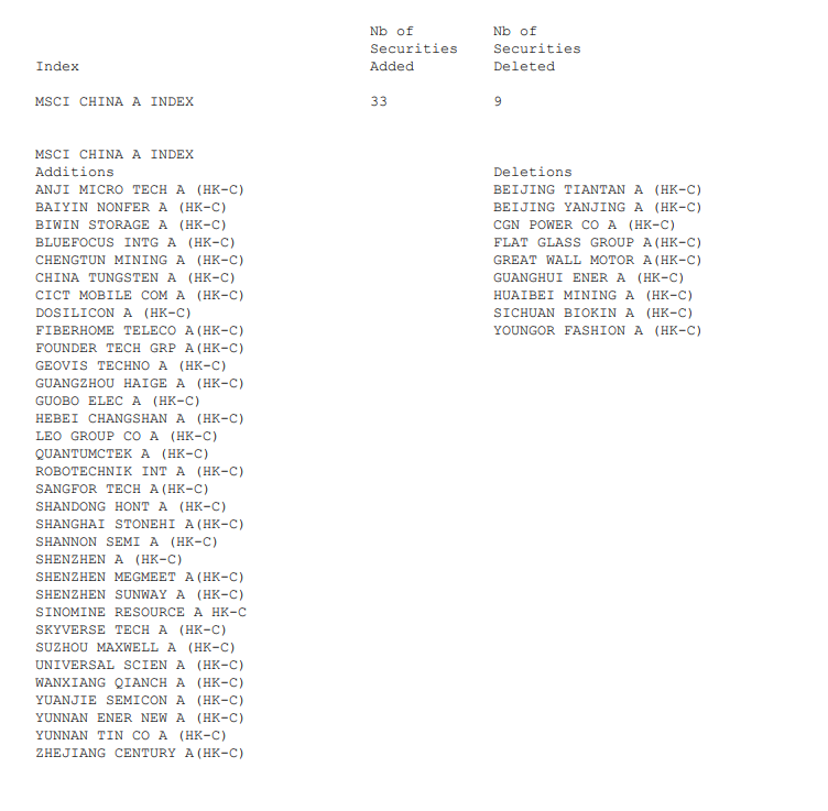 MSCI中国指数调整:新纳入白银有色等37只股票