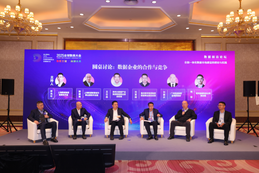 上海数据集团首席技术官苏光牛作为圆桌主持人,与重庆数字资源集团数据事业部总经理刘富阔、贵州大数据产业集团数据事业部总经理王仕品、广州数据集团首席数据官刘国庆、上海联通智慧城市事业部技术总监郭健海、瓴羊智能科技副总裁姚栋等5位嘉宾共话合作与发展。
