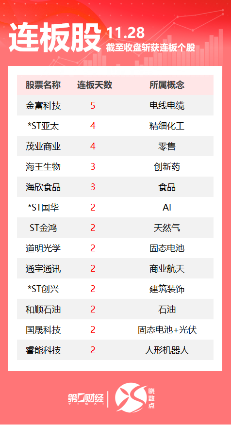 11月28日,Wind数据显示,A股市场共计82只个股涨停。其中电线电缆概念金富科技收获5连板,零售股茂业商业4连板。一图速览今日连板股>>