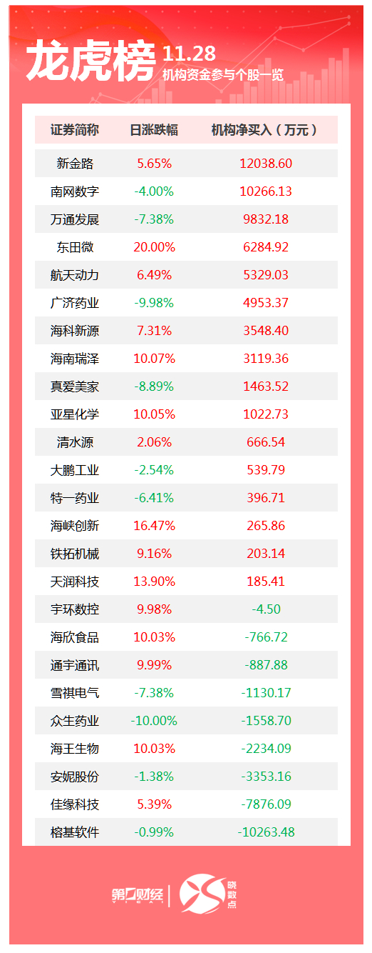 盘后数据显示,11月28日龙虎榜中,共25只个股出现了机构的身影,有16只股票呈现机构净买入,9只股票呈现机构净卖出。